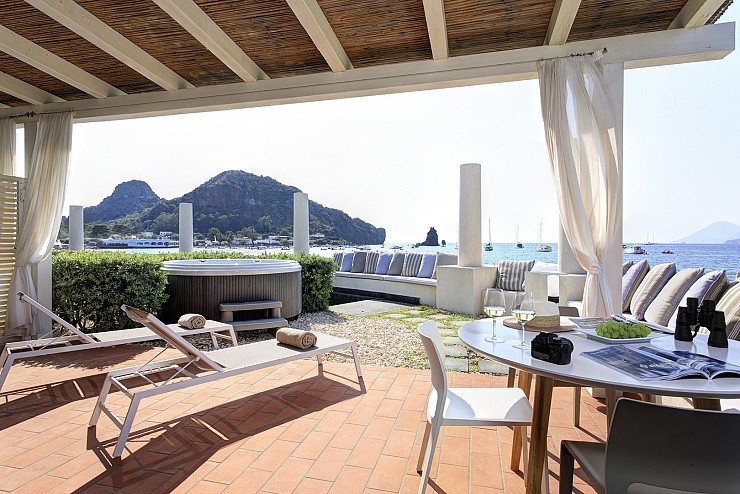 An elegant garden with an outdoor swimming pool and a splendid terrace overlooking the Bay of Ponente where you can sip your drinks while admiring the wonderful sunset of Vulcano. Colors, scents, emotions that will leave the mark of a sublime island holiday in you.